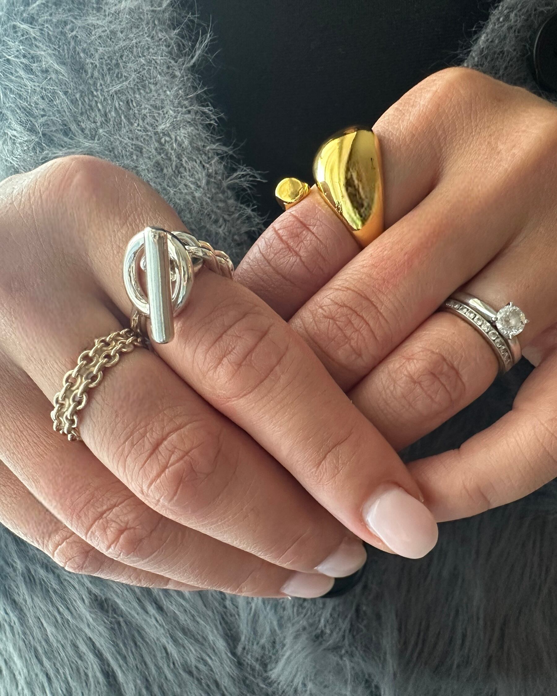 スウェットやシンプルなコーデのアクセントになって映えるリングです。
